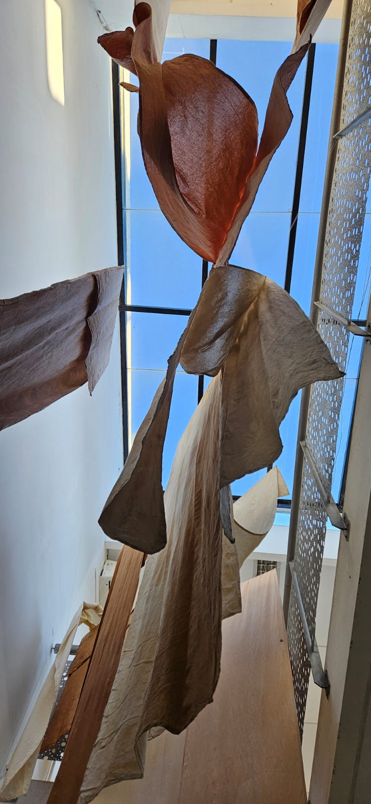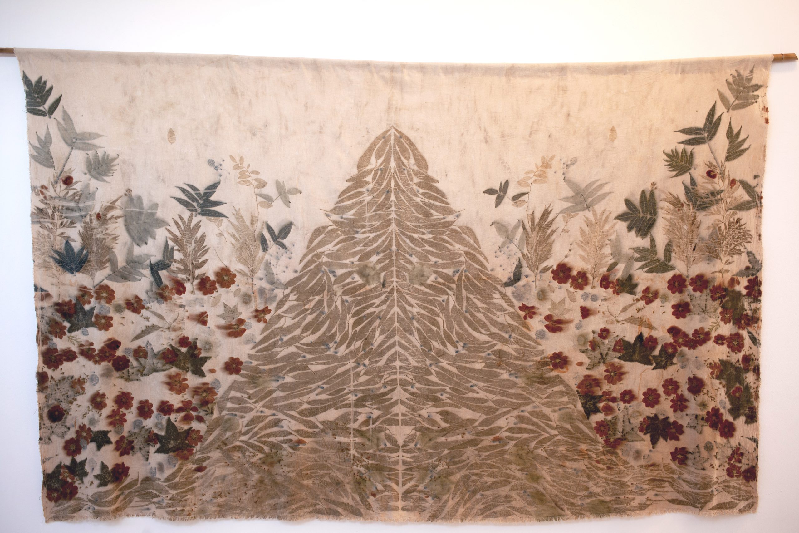 vidrio. A través de telas teñidas y estampadas con plantas que mutan con el tiempo, y