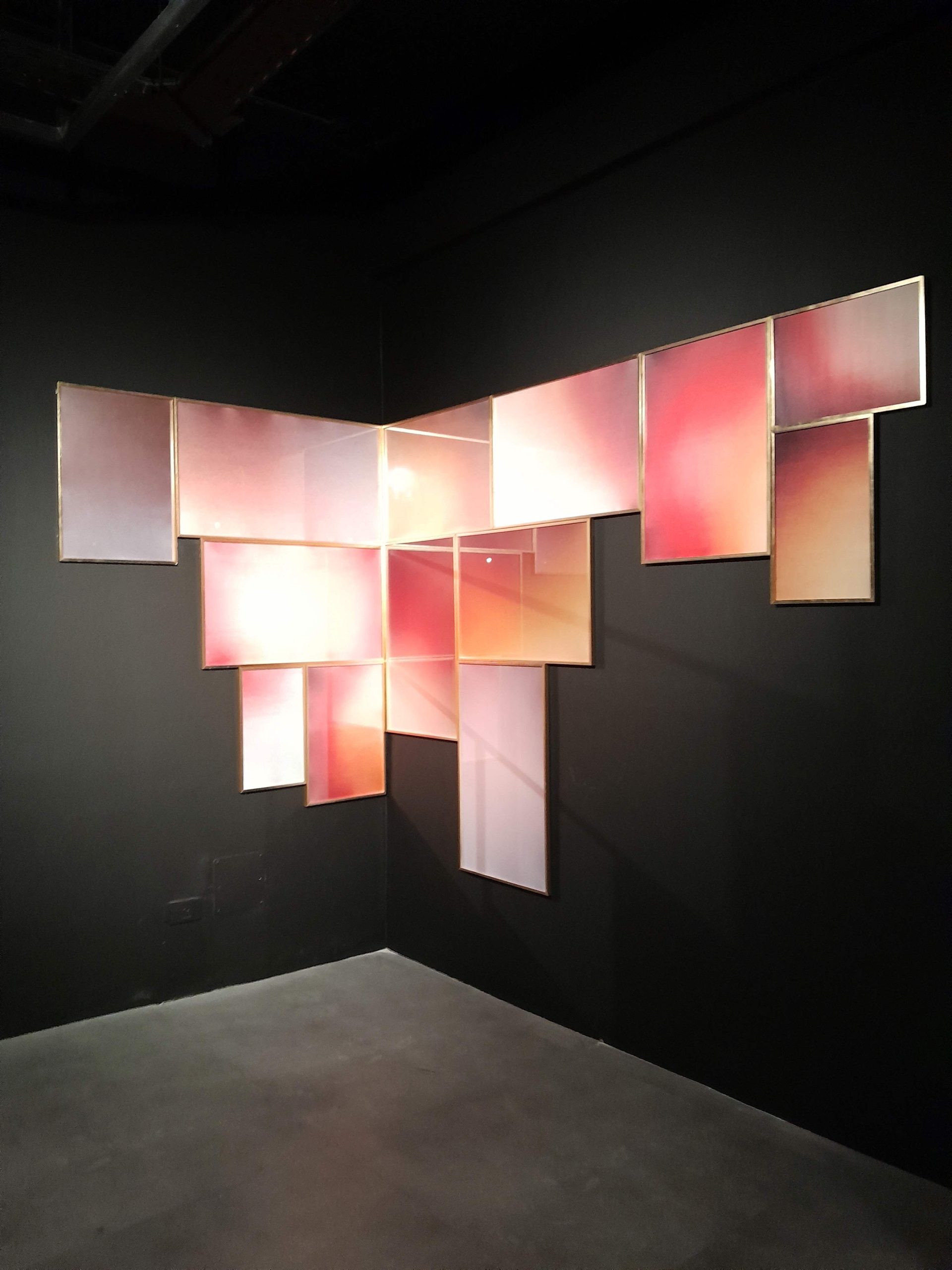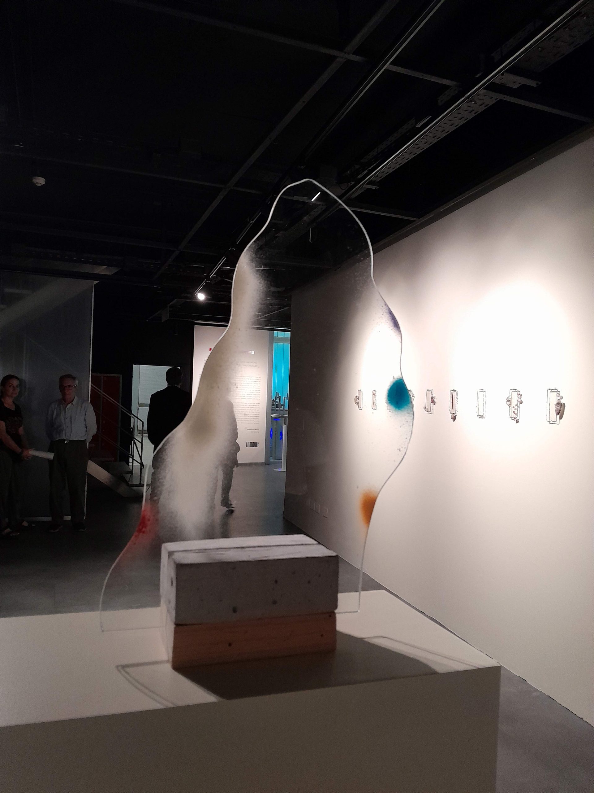 Las señales de heridas cerradas también van a aparecer en la obra de Mara Caffarone: un vitral con vidrios sin color muestra más claramente el dibujo de sus uniones, como cicatrices de algo que se ha roto. Es que se trata de pantallas de celular partidas que han dejado de cumplir su función de interfaz para mostrar su transparencia y su vacío, su pura superficie. Se convierten en souvenirs de selfies ausentes. Dejan de ser espejos para que nuestra mirada las atraviese, como atraviesa el vidrio de sus esculturas. ¿Cómo hacer visible esas irregulares formas cuando se camuflan y por lo tanto se esconden en el entorno? Vemos respiraciones de color, como quien deja el aliento en la ventana cuando adentro está tibio y afuera hace frío. Pero el vidrio aquí ha dejado de cumplir su función de separación y se muestra en su doble potencia de peligro y fragilidad. Mara, tensa las posibilidades de cada material para entender dónde podrían estar los límites.